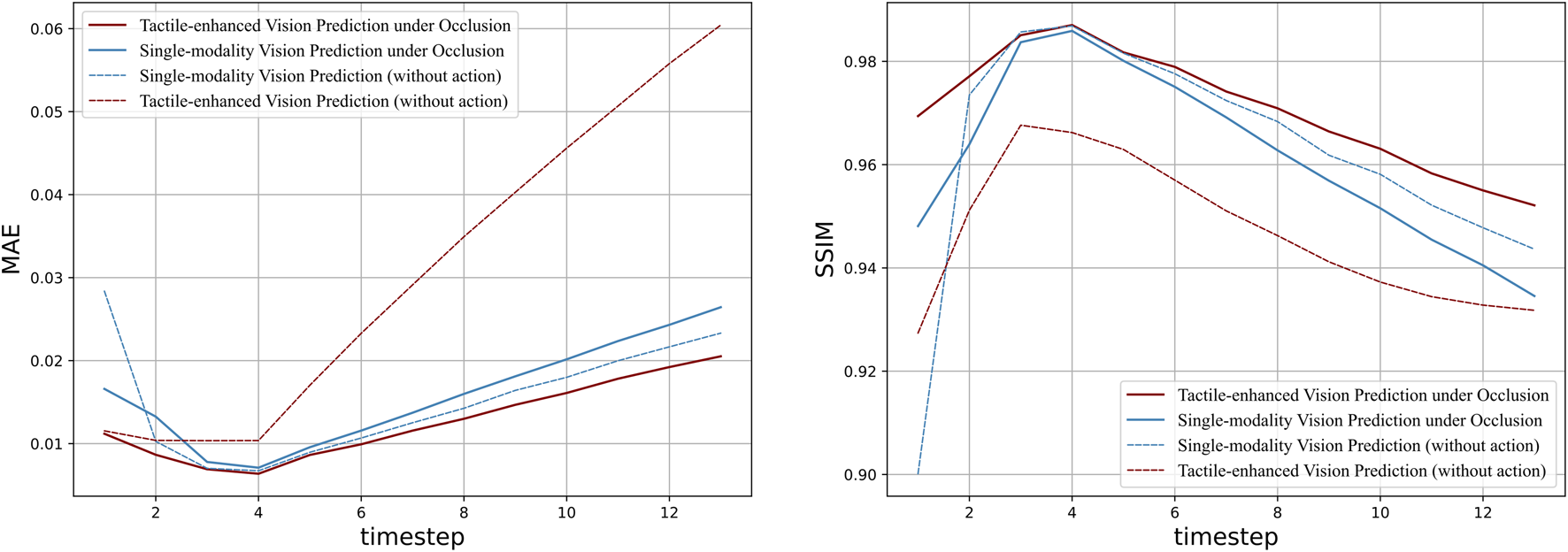 The progressive quantitative results illustrated in Figure 7 highlight the complementary effect of tactile sensory input when vision is impaired. The tactile-enhanced model consistently outperforms its single-modality counterparts across the entire prediction horizon, as evidenced by both MAE and SSIM metrics. And the increasing performance gap over time aligns with the qualitative results shown in Figure 6, where the benefits of tactile sensing is more significant in the later stage of prediction, displaying robustness over long time horizon. Additionally, the model conditioned on tactile data produce better results under occlusion than with fully available vision. This surprising phenomenon indicates that while tactile sensing may bring extra noises under simple interaction settings like straight-line pushing, it plays a crucial role in robotic perception in challenging scenarios with vision loss. As found in previous research, tactile sensing can become the primary source of information when visual input is compromised, enhancing overall system perception with its high sensitivity to detecting pressure and texture variation (Zou et al., 2017). This ability of tactile sensors to provide detailed and localized feedback becomes particularly valuable in scenarios where visual data is insufficient or occluded.