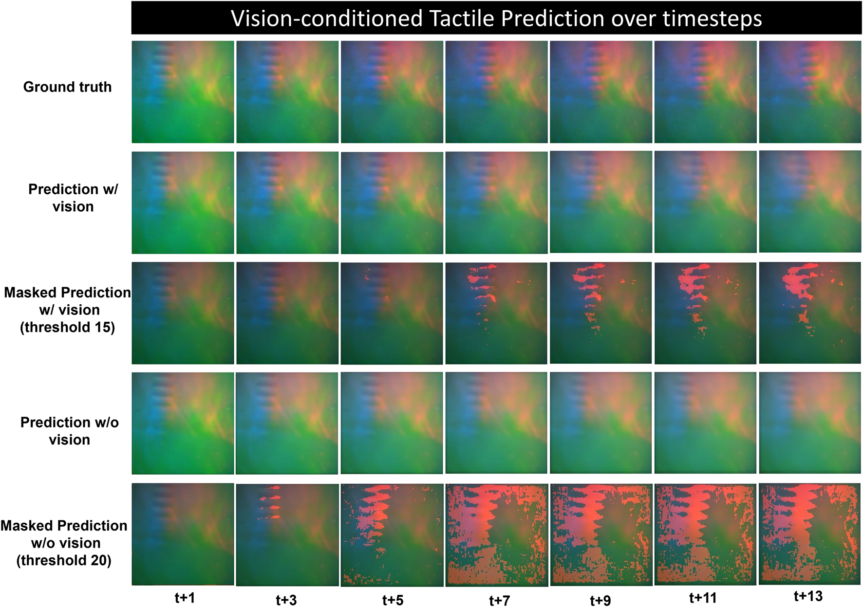 Qualitative results of tactile-conditioned vision prediction over long time horizon, the ground truth and predicted frames are shown at every three time steps from t+1 to t+13, the last row depicts the error map that show the prediction error more explicitly.