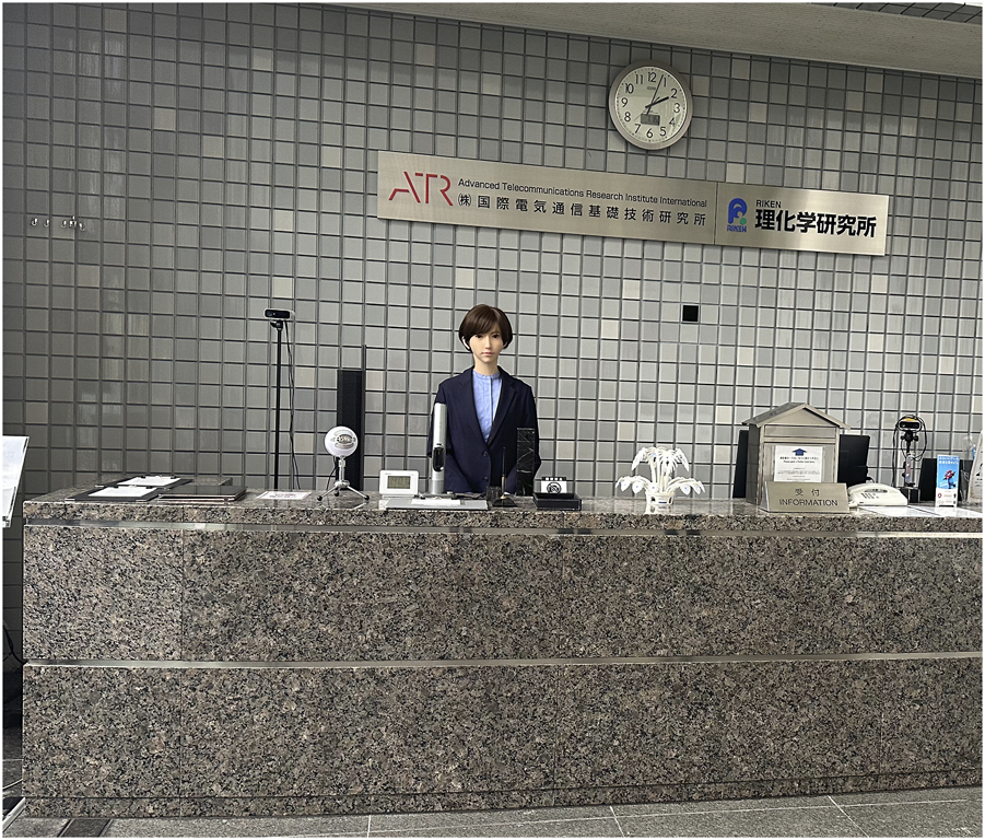 In the creation of our video materials, both the robot as the avatar (Figure 1) and the human operator were depicted explaining the significance and utility of using robots as avatars. The robot used as an avatar in both Study one and Study two is the android ERICA (Glas et al., 2016; Minato et al., 2022). ERICA stands 166 cm tall in an upright position and features 44 active joints and 30 passive degrees of freedom. The robot’s movements are powered by pneumatic actuators. The video tailored for Dubai was produced in English, with a duration of 1 min and 50 s, while the version for Japan was made in Japanese, lasting 1 min and 41 s. The content provided by the avatar and the humans is parallel, the audio is played identically and identical scripts translated into the respective languages are used. In the video, both the avatar and the human operator began by introducing themselves, after which they proceeded to explain the applications of the avatar and the characteristics of the robot (see Supplementary Material).