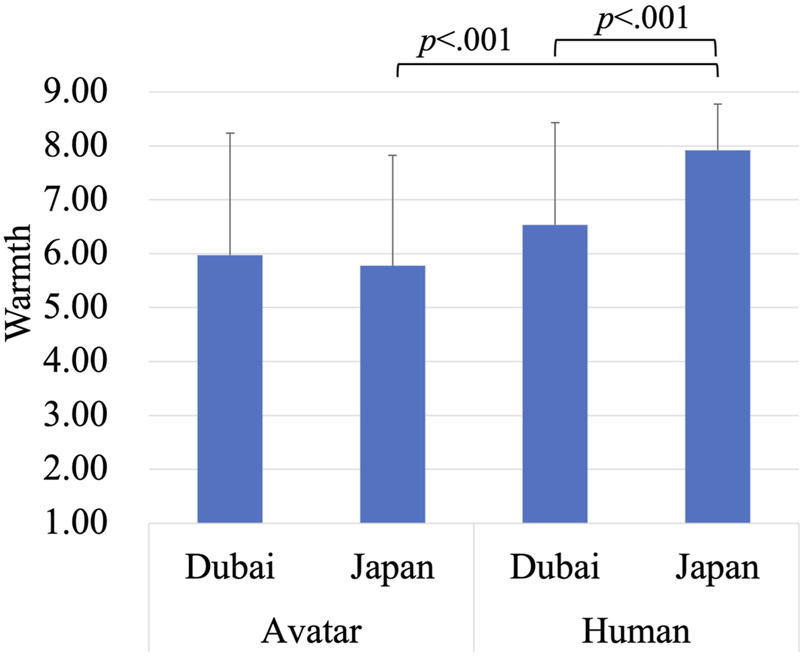 Subsequently, a mixed ANOVA was conducted to investigate the effects of region (Dubai vs. Japan) and target type (avatar vs. human) on perceived warmth (Figure 2). The between-subjects factor was region, with two levels: Dubai and Japan. The within-subjects factor was target type, also with two levels: avatar and human. There was a significant main effect of region, F (1, 238) = 49.10, p < 0.001, indicating that perceived warmth was higher in Dubai (M = 5.77, SD = 1.70) compared to Japan (M = 4.09, SD = 1.70). Additionally, a significant main effect of target type was found, F (1, 238) = 65.69, p < 0.001, showing that the avatar (M = 4.46, SD = 2.31) were rated lower in warmth than the human (M = 5.39, SD = 2.12). The interaction effect between region and target type was not significant.