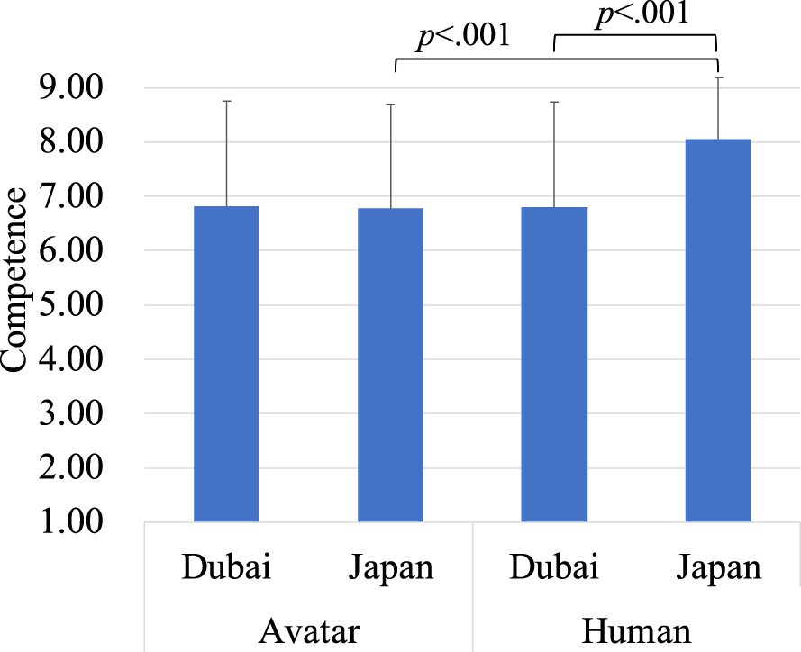 Similarly, the analysis on competence revealed a significant main effect of region, F (1, 238) = 23.22, p < 0.001, indicating that perceived competence was higher in Dubai (M = 6.14, SD = 0.17) compared to Japan (M = 5.01, SD = 0.17). Furthermore, the main effect of the target type was significant, F (1, 238) = 22.59, p < 0.001, indicating that perceived competence was higher in the human (M = 5.85, SD = 1.99) compared to the avatar (M = 5.31, SD = 2.20). There was not a significant interaction effect between region and target type (Figure 3).