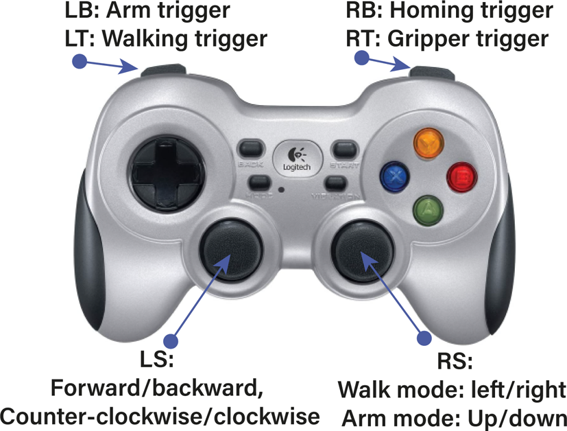 Gamepads are prevalent in robot control systems, with many quadruped manufacturers supplying them as the standard control device for their commercial clients. In our study, we aimed to assess the efficacy of the wearable motion capture system in contrast with a conventional gamepad (Figure 5). To ensure a fair comparison, both control methods employed identical teleoperation strategies: velocity control for locomotion and position control for manipulation. Specifically, the gamepad’s trigger and bumper buttons were programmed to correspond to triggers in the teleoperation system, and the joysticks were configured to regulate relative position and velocity. Participants were asked to teleoperate a legged manipulator robot to complete a series of tasks using both types of controllers, with the completion time of each task serving as the performance metric.