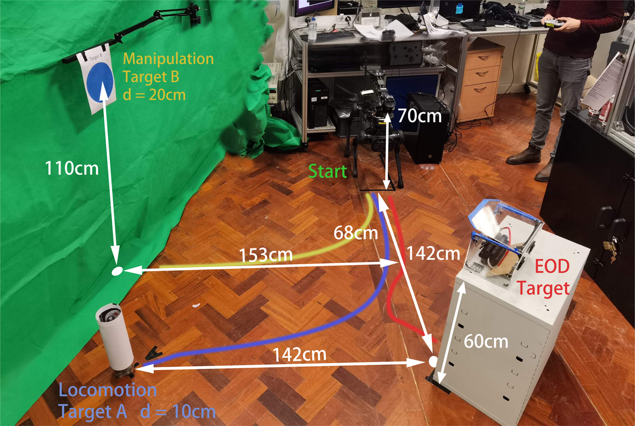 4. The final EOD task simulated a practical application scenario where the robot had to approach a bomb placed inside a container, starting from the initial point. The robot was then required to open the container and extract a red wire from the bomb using its manipulator.