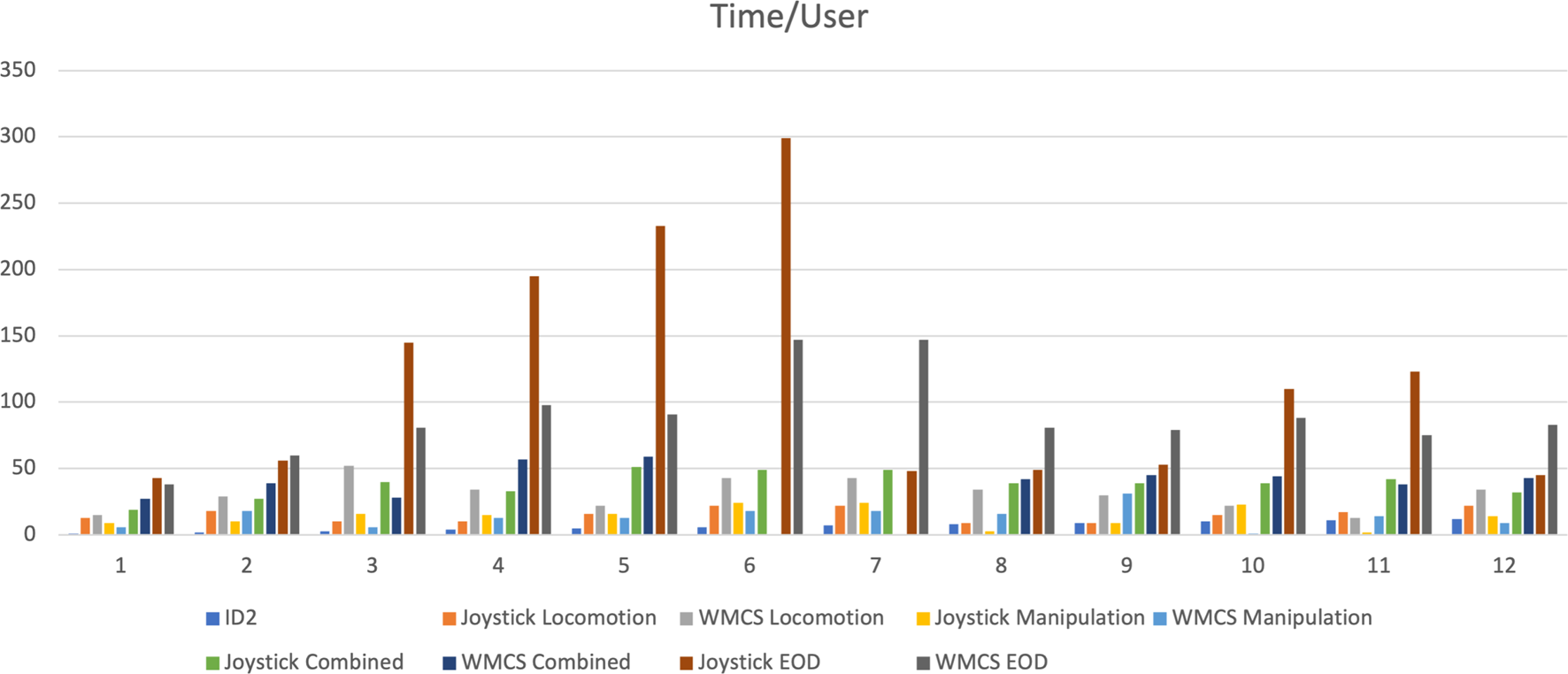 Total of 12 (4 female, eight male) participants’ data was collected for the study. Among these, 11 participants completed all the experiment tasks within a reasonable time frame without failure, and user No. Six was unable to complete the combined task due to tactical challenges. These participants’ ages ranged from 21 to 32 years old (mean age: 25.4 years), and they reported an average computer gamepad experience of 2.5 (on a scale of 0–9). The volunteers received basic instructions on how to use the controllers but were not offered additional practice time before commencing the tasks.