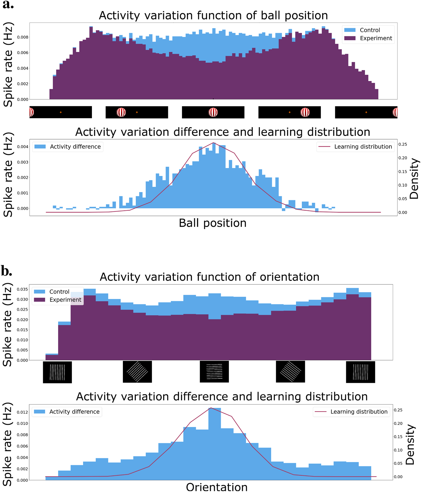 This lateral inhibition mechanism can be interpreted as a form of predictive learning. When presented with a moving stimulus, like a moving edge, adjacent simple cells activate close in time in a specific pattern. The first set of simple cells activates and sends inhibitory signals to adjacent simple cells. As the edge moves, it activates neighboring simple cells, some of which just received inhibitory signals. These connections are reinforced, as illustrated in Figure 2B. With repeated visual patterns, the inhibitory connections become strong, making simple cells predictors of the pattern. For example, a moving edge triggering the first set of simple cells will strongly inhibit those associated with the next location, reducing total network activity for this pattern. If a different pattern, such as an edge moving in another direction, is presented, network activity remains unchanged since the inhibition does not affect simple cells triggered by this new pattern.