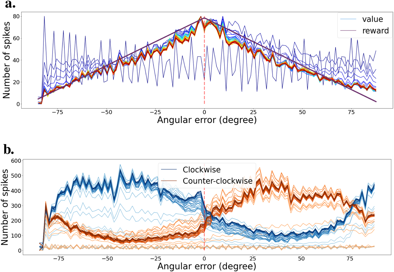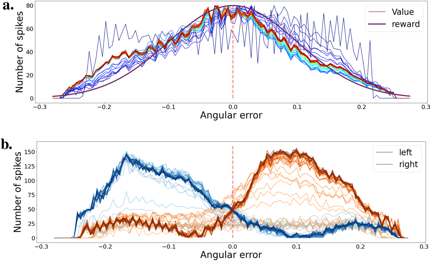 One limitation of the above formulation is that the value function estimation is proportional to the critic neuron spike rate. Neuronal spike rates are dependent on two main factors: the synaptic weight value of inputs, and the amount of input itself. When submitted to many events, the network’s simple and complex cells will inevitably spike more than when fewer events are present. This, in turn, will drive the critic neurons more, which will impact the value estimation. This is an important difference compared to the work of Frémaux et al. (2013). In their model, they ensure that the amount of activity in the population of state representation spiking neurons stays constant over time. But with event-based visual input, the amount of activity can vary substantially.