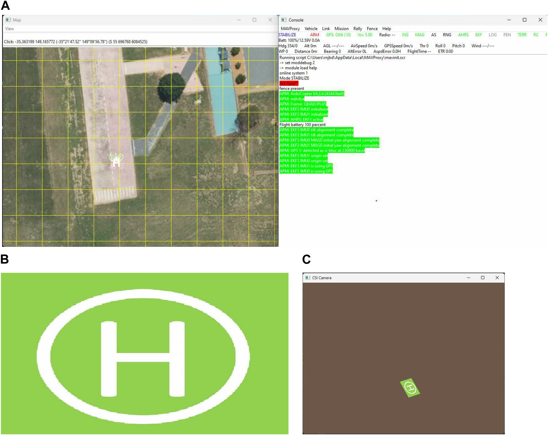 One of the crucial steps to ensure the autonomous landing is to verify the accuracy of conversions while the algorithm is running. We performed a test to check whether the conversion of distance from pixels to meters is accurate. For this, we took distance measurements between various marked points using a measuring tape. The pictures of these points are taken from the camera in the UAV during a flight, and the altitude of the UAV is continuously recorded for each corresponding frame. Using the images and the corresponding altitude, the distance between the marked points is calculated using the formulae in Section 3.4. The difference between the actual measurements and the calculations is then checked. Table 1 presents the results of this test. The table shows the images captured from the drone, the altitude from which the image was taken, the picture instance of the measurement being taken for the corresponding points, the calculated distance, the measured distance, and the error. It can be verified from Table 1 that the distance calculated in terms of meters based on the images captured from the UAV is accurate enough for the same method to be used in the autonomous landing algorithm.