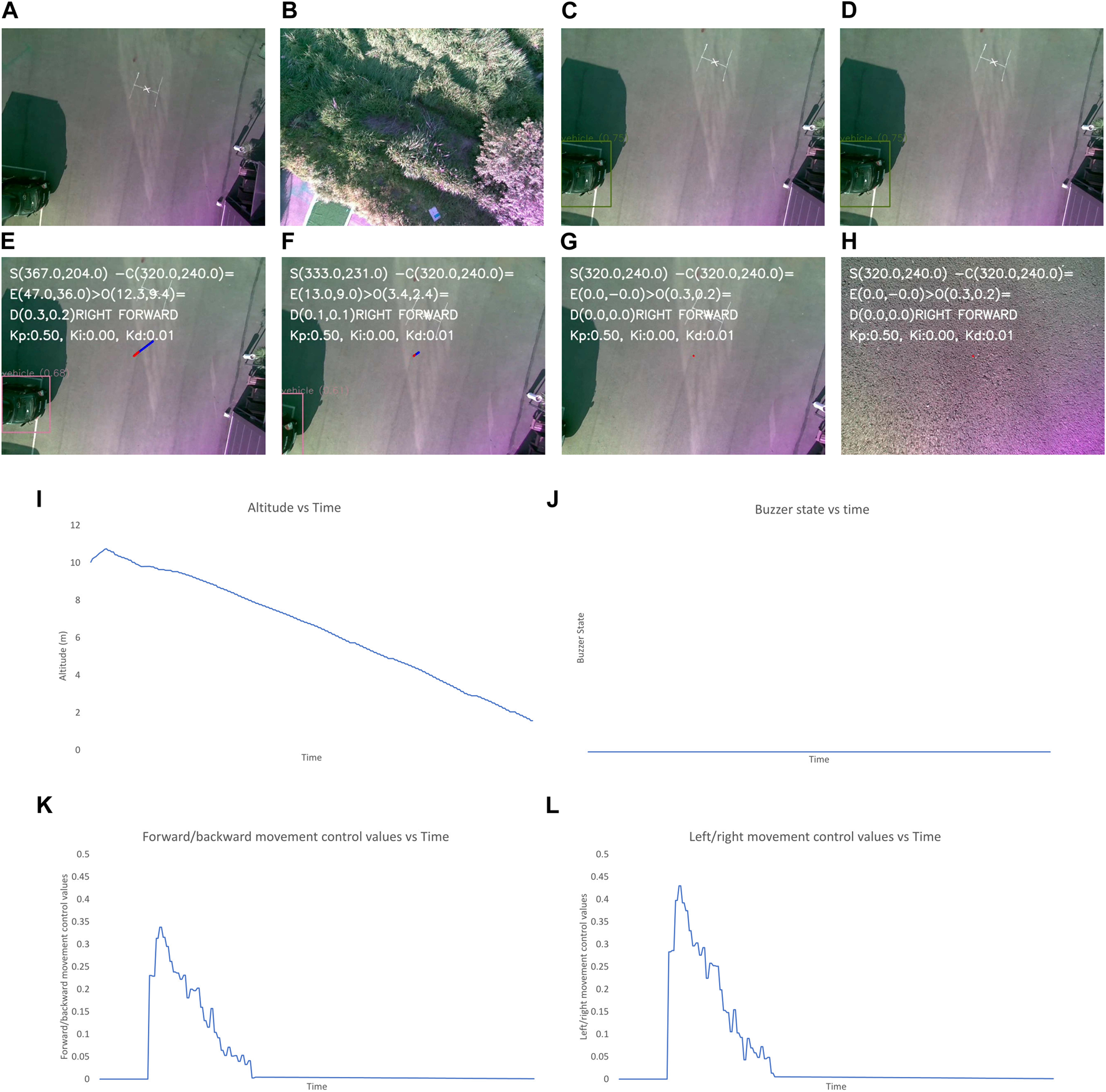In Equations 1, 2, the and are the control values generated by the two controllers for controlling the left/right and the forward/backward movement of the UAV and and are the error in x-coordinate and y-coordinate respectively.