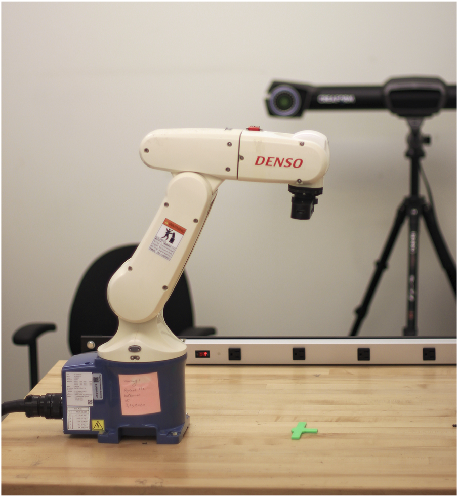 Similar to the setup in our simulations (see Figure 3), our experimental layout includes a 6-DOF Denso robotic manipulator, an Intel RealSense D415 RGB camera for high-quality image capture, and a green 3D-printed targeting pin that mimics the ISS’s guiding markers, as illustrated in Figure 5.
