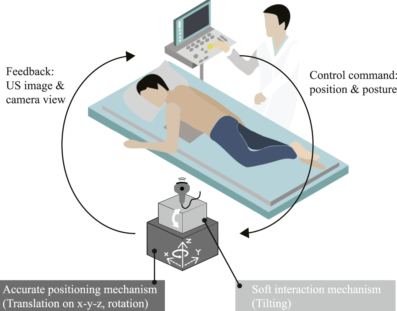 von Haxthausen et al., 2021), the missing step toward a fully autonomous RUS is a robotic platform with a reliable movement and safety strategy in a closed-loop control. We hypothesize that utilizing prone position to design a robot that scan from below the patient could eliminate the risk of the patient getting clamped while allowing robot design with minimum RoM to reach the cardiac windows without the need of a human assistant (
