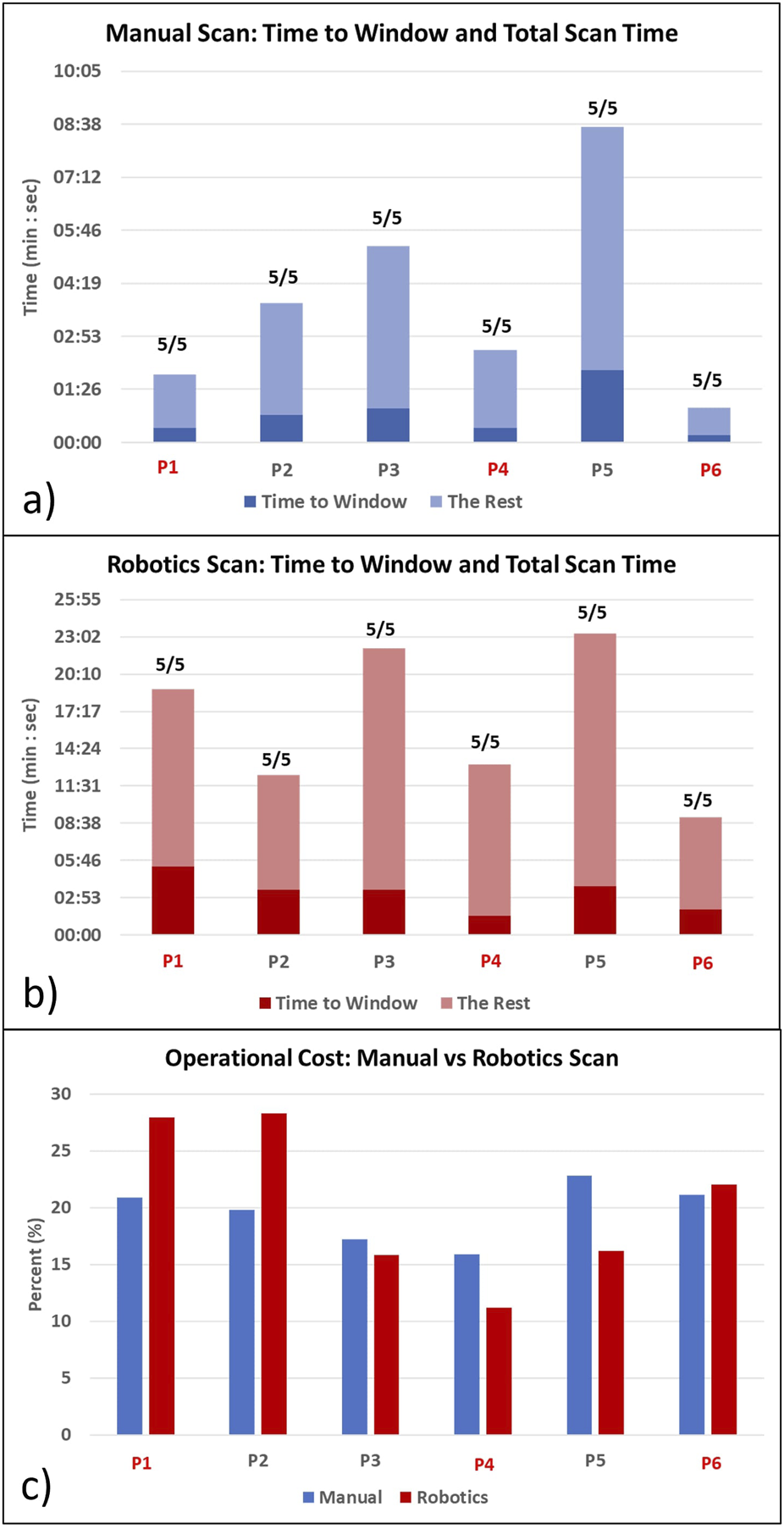 To compare the scanning performance and assess the effort of finding the parasternal window, we calculated the ratio of the time to get the first clinically meaningful image (time to the window) to the total scanning time for each participant’s manual and robotic scanning. We call this ratio the operational cost. For example, in the robotic scanning, P1 time to window was 12 min while P1 total scanning time was 37 min. Therefore, the operational cost for P1 in the robotic scanning was 12/37 = 33%.In addition, we checked how many of the five required parasternal views each participant could obtain.