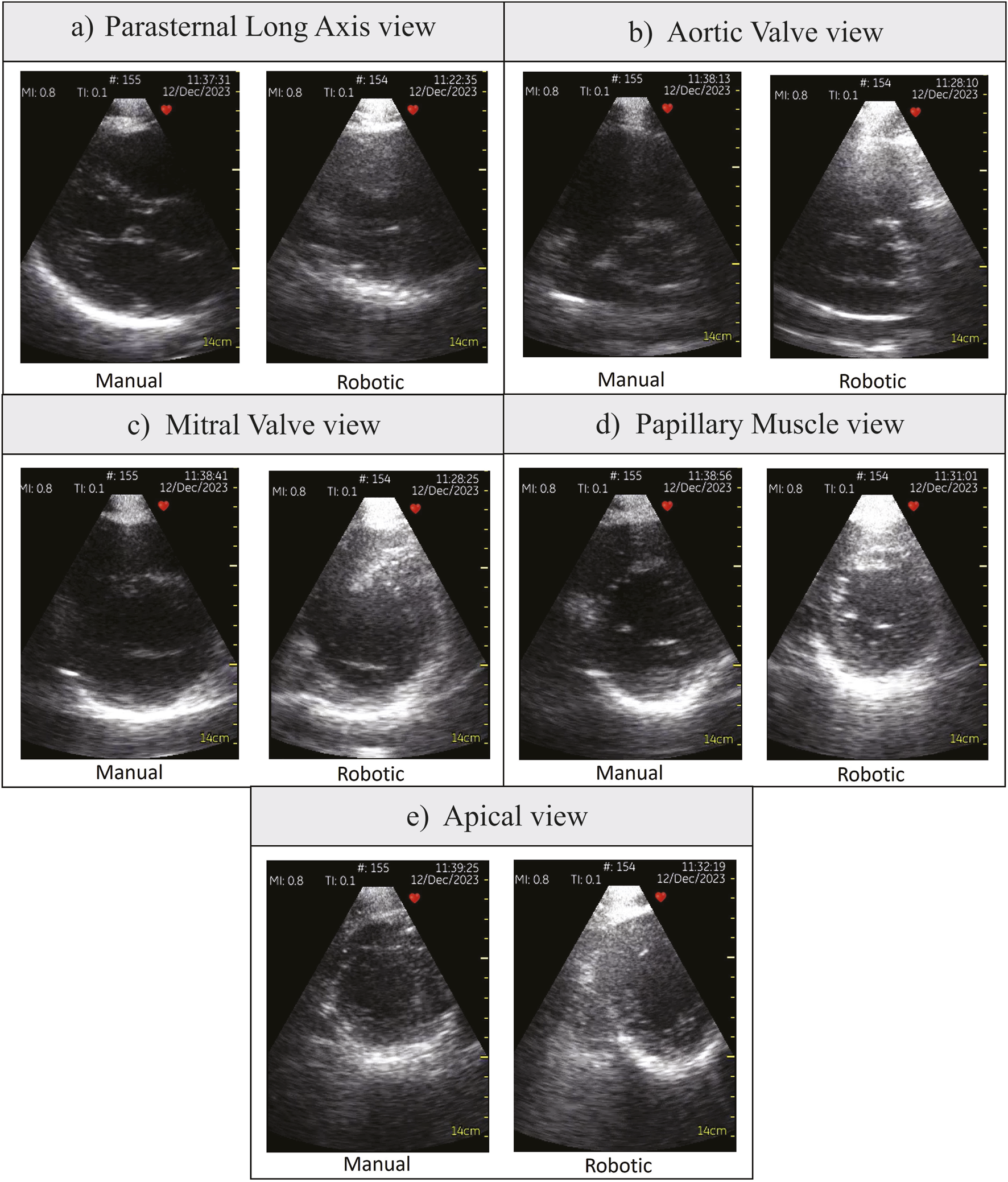 We obtained ethical consent from the Faculty of Engineering, Information, and Systems, University of Tsukuba (approval number 2022R716). Prior to the experiments, we took informed consents from all the participants, including consent to publish identifiable images or videos. We recruited six medical personnel: three medical students, and three expert cardiologists. All medical personnel scanned the same healthy male participant (age = 31, Body Mass Index = 25) to avoid bias in the scanning time and the image results. The medical personnel’s task is to obtain five distinct views from the parasternal axis, both manually and using the robot. The views are: Parasternal Long Axis (PLAX), Parasternal Short Axis (PSAX) aortic valve (AV) level, PSAX mitral valve (MV) level, PSAX papillary muscle (PM) level, and PSAX apical level. We chose the parasternal window as the testbed because it was difficult to obtain in manual prone position scanning (Roemer et al., 2020; Gibson et al., 2020). We picked the five views because the user must move the robot in all DoFs (translation, rotation, and tilting) to obtain them.