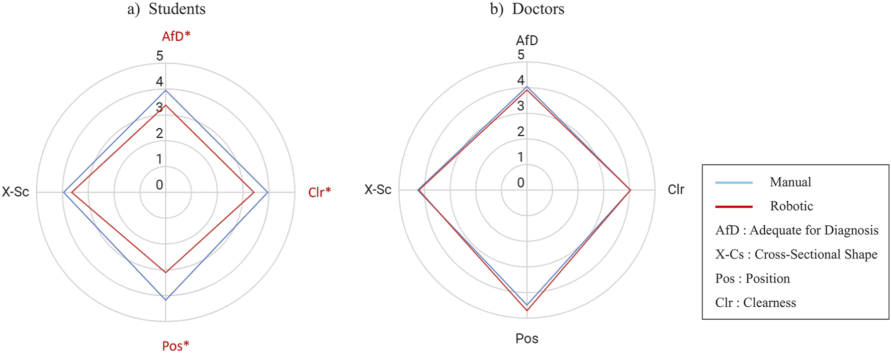 Score comparison (mean) of the four evaluation metrics for robotic vs. manually scanned images in (A) students group and (B) doctors group. The value is a five points Likert scale. An asterisk and red color mark a metric with a significant difference. The statistical test was a two-tailed Wilcoxon signed-rank with = 0.05.