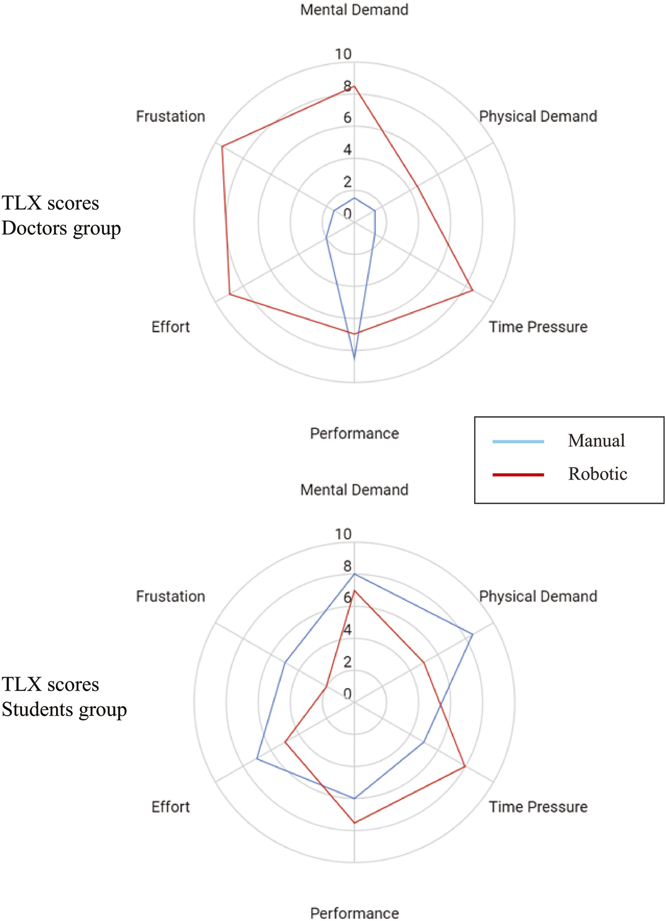 Figure 8 shows the TLX score from the doctors group and the students group comparing the manual and robotics scan. Two of the doctors and two of the students filled the TLX questionnaire. Statistical tests were not performed due to the small amount of samples. However, from the score we can infer several points. First, the doctors perceived that their performance did not decrease much with the robot, while the other aspects increased. Second, the students perceived that using the robot they could perform better than manually, while having less effort, frustration, mental, and physical demand. Third, the students and doctors both perceive the same level of physical demand, time pressure, and performance with the robot, with the value of 5,8, and 7, respectively.