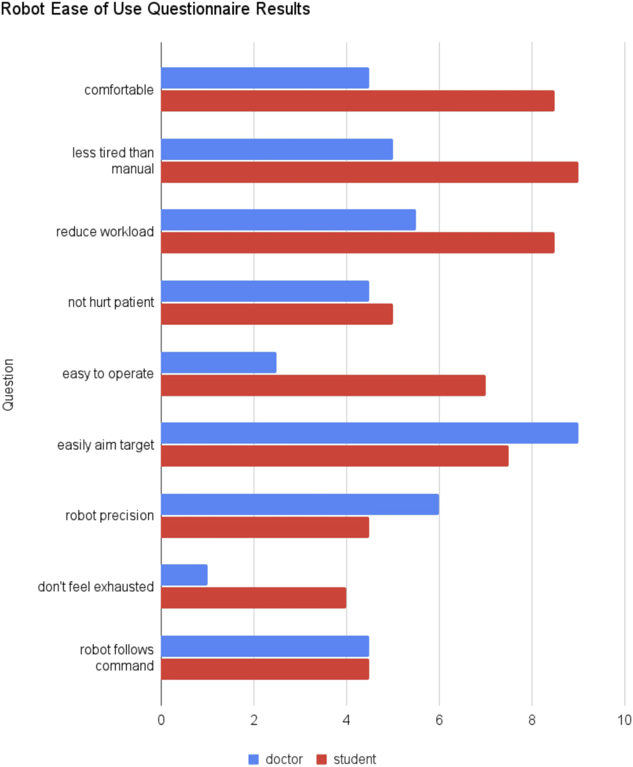 Robot ease of use questionnaire results comparing the median of doctors and students group.