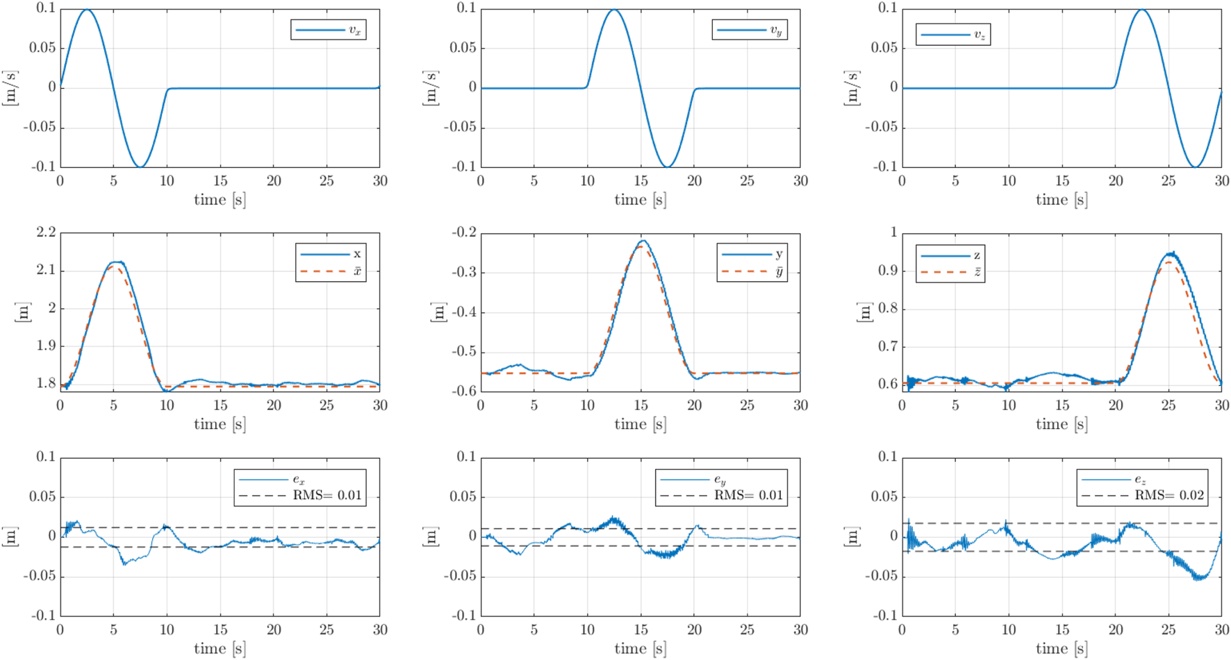 Figure 6 shows the pose tracking results for the F1150 model, which is shown in Figure 7. From the top to the bottom are the speed input reference, the comparison between the target pose resulting from the speed integration and the actual pose of the crane, and the tracking error. The RMS for the tracking error is equal to for all the Cartesian directions. The peaks of tracking errors are approximately and appear at the change of speed direction.