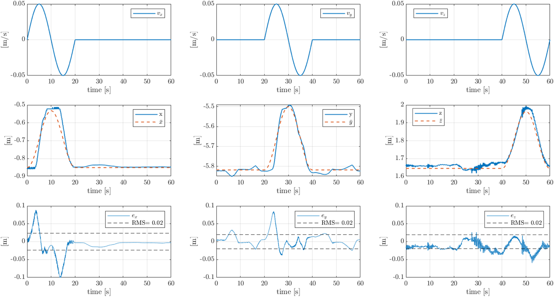 We observed an actuation delay of for the M20 model and for the F1150 model. For both cranes, we evaluated the Cartesian pose tracking performance of the Cranebot control for a sequence of sinusoidal speed profiles, which were given as input sequentially to each Cartesian coordinate, with total target displacement for each Cartesian direction of approximately and with the maximum speed module of for the M20 model and for the F1150 model. Note that, although we move the boom tip along one coordinate at the time, the control is actively coordinating and controlling all the crane’s actuations to track the overall position target. Experiments start from a Cartesian position that we consider realistic for a generic pick-and-place activity. All tests are performed without load attached.
