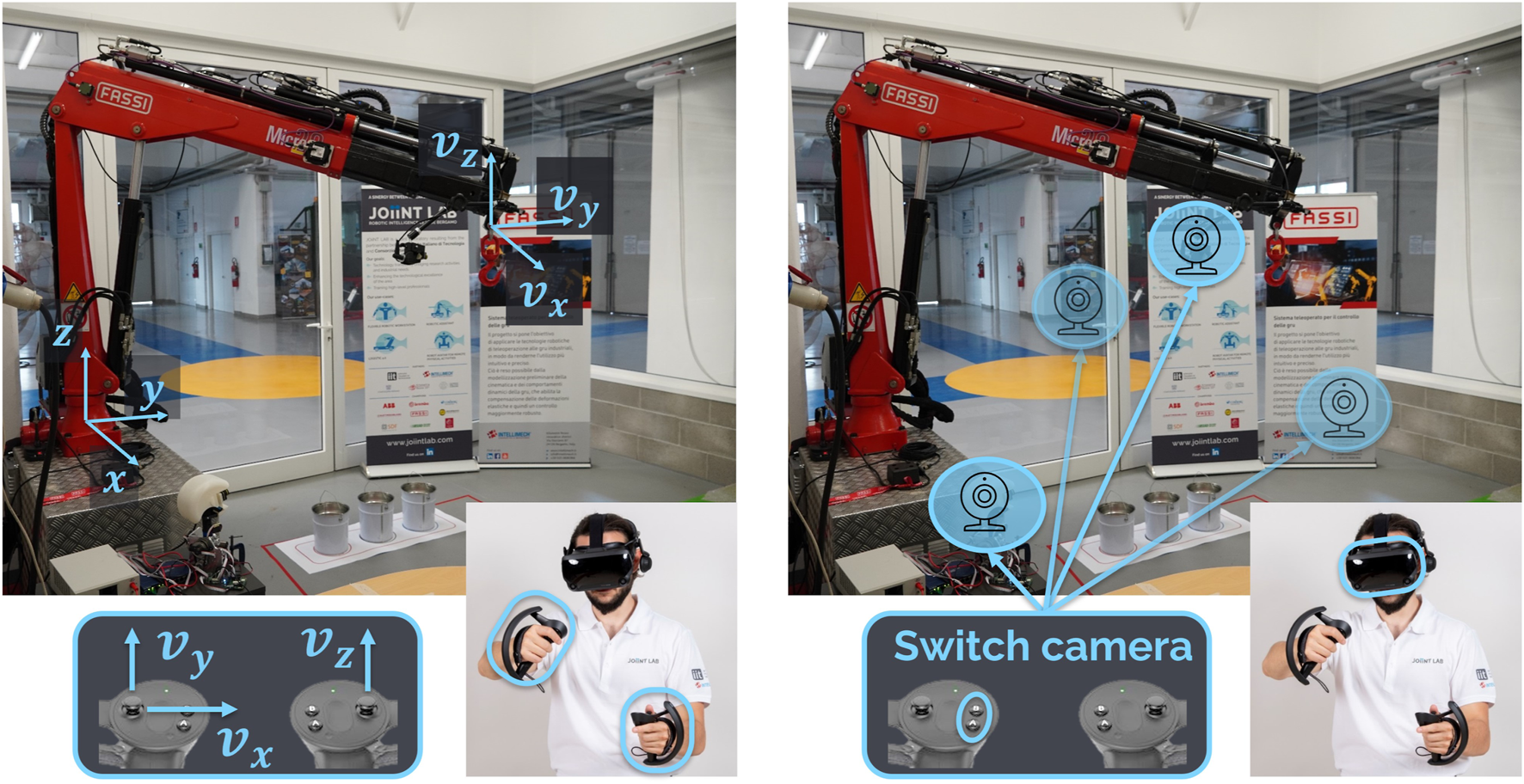 Crane’s perception: the visual feedback of the crane’s surrounding environment is provided by a VR headset or head-mounted display (HMD). This is a highly immersive tool that completely disconnects users from their immediate surroundings, allowing them to focus only on the crane. On the crane side, we envision multiple cameras to provide the different points of view that are useful for task completion. A camera mounted on the crane base (e.g. truck) gives awareness of the global environment, such as obstacles or people, while a camera on the boom tip provides a closer focus on the target. They can be mounted on a fixed or a mobile actuated support. When the camera’s support is actuated, we can tilt the camera to track the orientation of the operator’s head as an extension of the operator’s neck. This choice allows a wider visual exploration of the environment in a natural and immersive way. This perception aids in providing a remote crane operator with full awareness of the crane and surrounding environment. Figure 8 shows an example of the cameras’ setup, with the HMD returning the visual to the operator and the possibility to switch between different cameras through the controllers’ input.