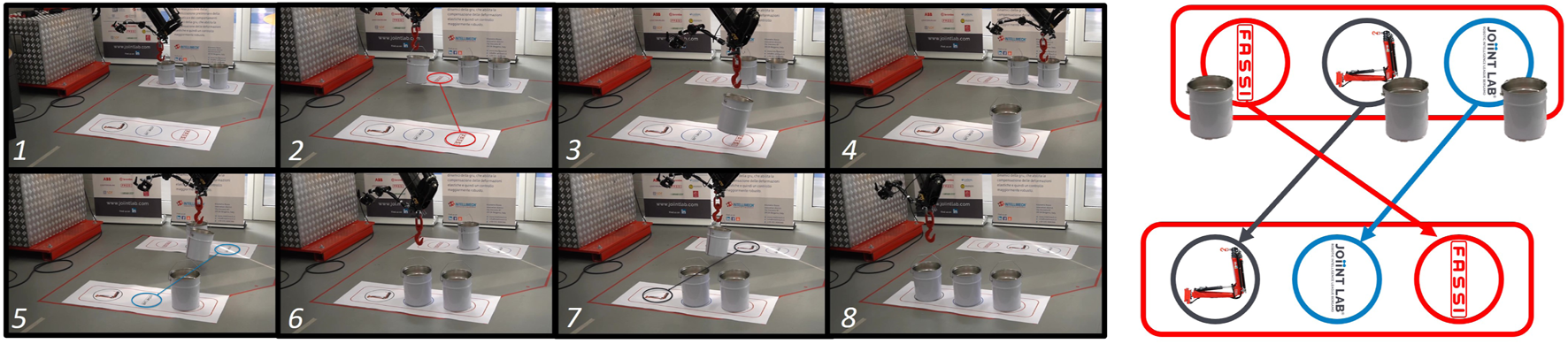 For the test, we simulated a repeated pick-and-place action, a typical crane task in construction sites, such as downloading a truck. Figure 10 shows a sequence from one of the test sessions: three buckets are aligned on one side of the room, and the user has to move them with the crane to the opposite side, matching the symbols printed under them. We asked to complete the task in the shortest possible time, having a hard constraint of 4 min, provided by a timer projected on the operator’s screen, and beyond this limit, the game ended. To be successfully remotely performed, this task required enhanced perception capabilities and fine control of crane’s movements, given the size of the hook and the bucket’s handle. An extract of the experiments is reported in the video provided as Supplementary Material.