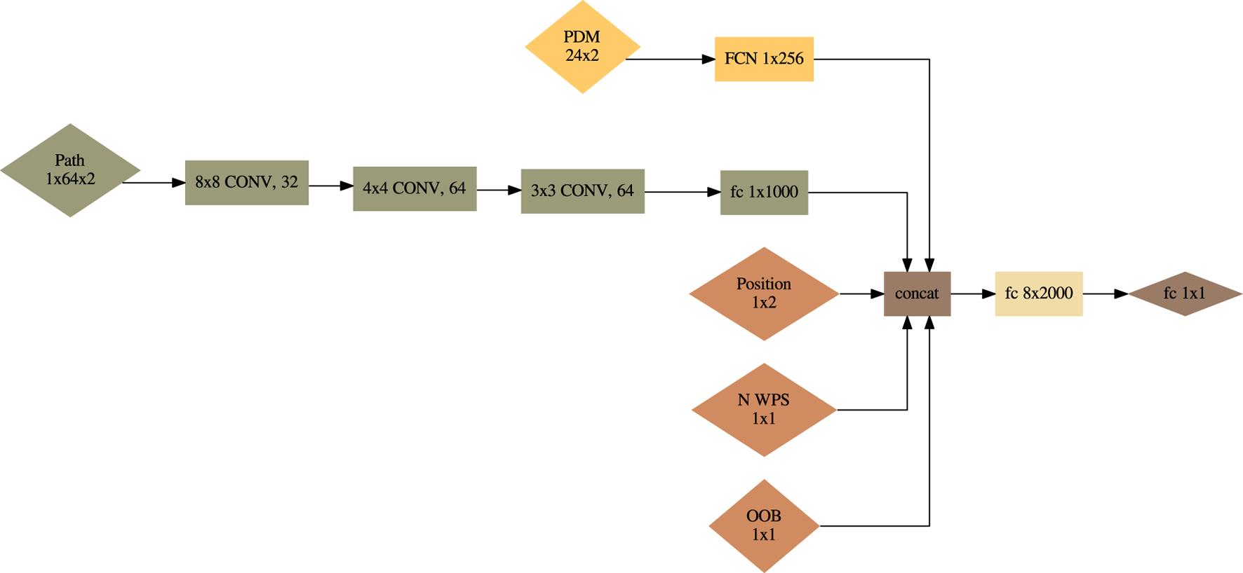 The core of the policy network consists of a fully connected network with layers, each with a width of . The observation definitions are given in Table 3 resulting in observation inputs. The policy is constructed to handle multiple input observation spaces and is defined in Figure 5. The inner workings of the policy are defined in Algorithm 1.