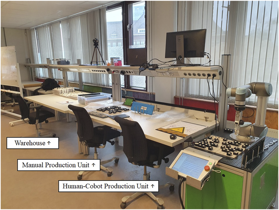 We developed a research setting in a laboratory environment to carefully research the concepts under study (Falk and Heckman, 2009). First, we determined the setting’s design parameters: multiple job decision latitudes, ample opportunity for different human–cobot interdependence levels, safe and user-friendly cobot applications, features to measure the core concepts and sub-concepts under study, and a manageable procedure. We used the human–robot workstation design method detailed by Ore, et al. (2017) to build our research setting. As per the recommendations of Ore et al. (2017), we planned and clarified the task under study (i.e., assembly), developed the first simple conceptual design (i.e., gateway assembly), and worked toward a more complex embodiment design (i.e., keyboard assembly). The embodiment design was pre-tested with 12 subjects and further developed into a detailed design that captured one warehouse, one manual production unit, and three human–cobot production units with distinct job decision latitudes (Figure 2)—we developed three human–cobot production units since there are no guidelines stating what or how many job decision latitudes would enable the operator to achieve acceptable outcomes. The research setting took 6 months to be operationalised.