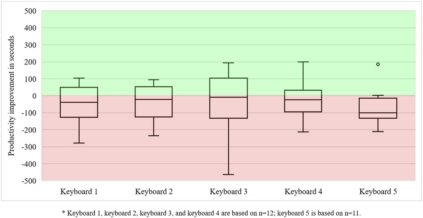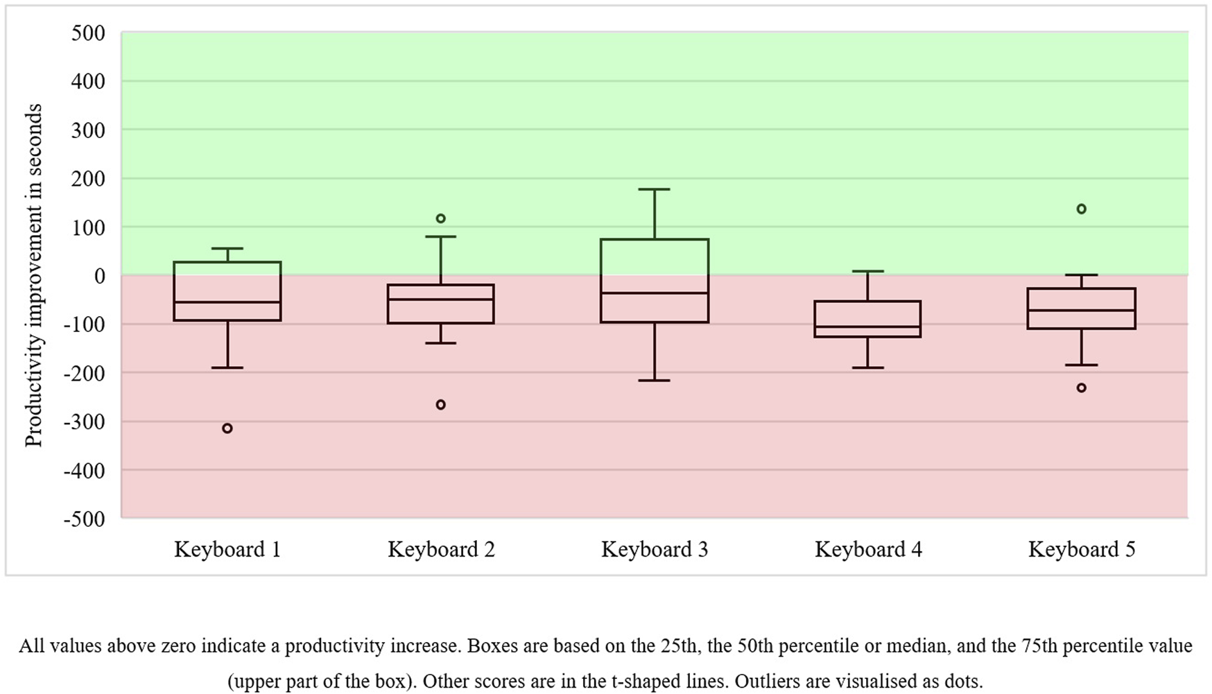 The scorecards were analysed to determine the production reliability (i.e., less or more error-free and timely submissions) and productivity (i.e., longer or shorter handling time) outcomes per keyboard. These outcomes were totalled, averaged, and equipped with a standard deviation if possible. For the motivational characteristics, we checked the work design questionnaires for any response set. Questionnaires with an incorrect manipulation question were excluded from the dataset. In total, 31 manual and 37 collaborative entries were included. The validity of the questionnaire is supported by the convincing work of Morgeson and Humphrey (2006) and Humphrey et al. (2007). Boxplots were created to visualise the developments in productivity and motivational characteristics.