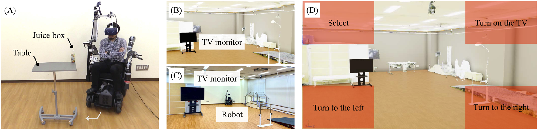 The primary endpoint was the success rate of the task, and the secondary endpoints were the execution time of each task and score of the system usability scale (Tamantini et al., 2023). The initial state of the participants in the virtual room involved sitting on a chair. The participants were two able-bodied individuals. This study was approved by the Research Ethics Committee of the Graduate School of Systems and Information Engineering, University of Tsukuba. Informed consent was obtained from all participants. All experiments were conducted according to the tenets of the Declaration of Helsinki.