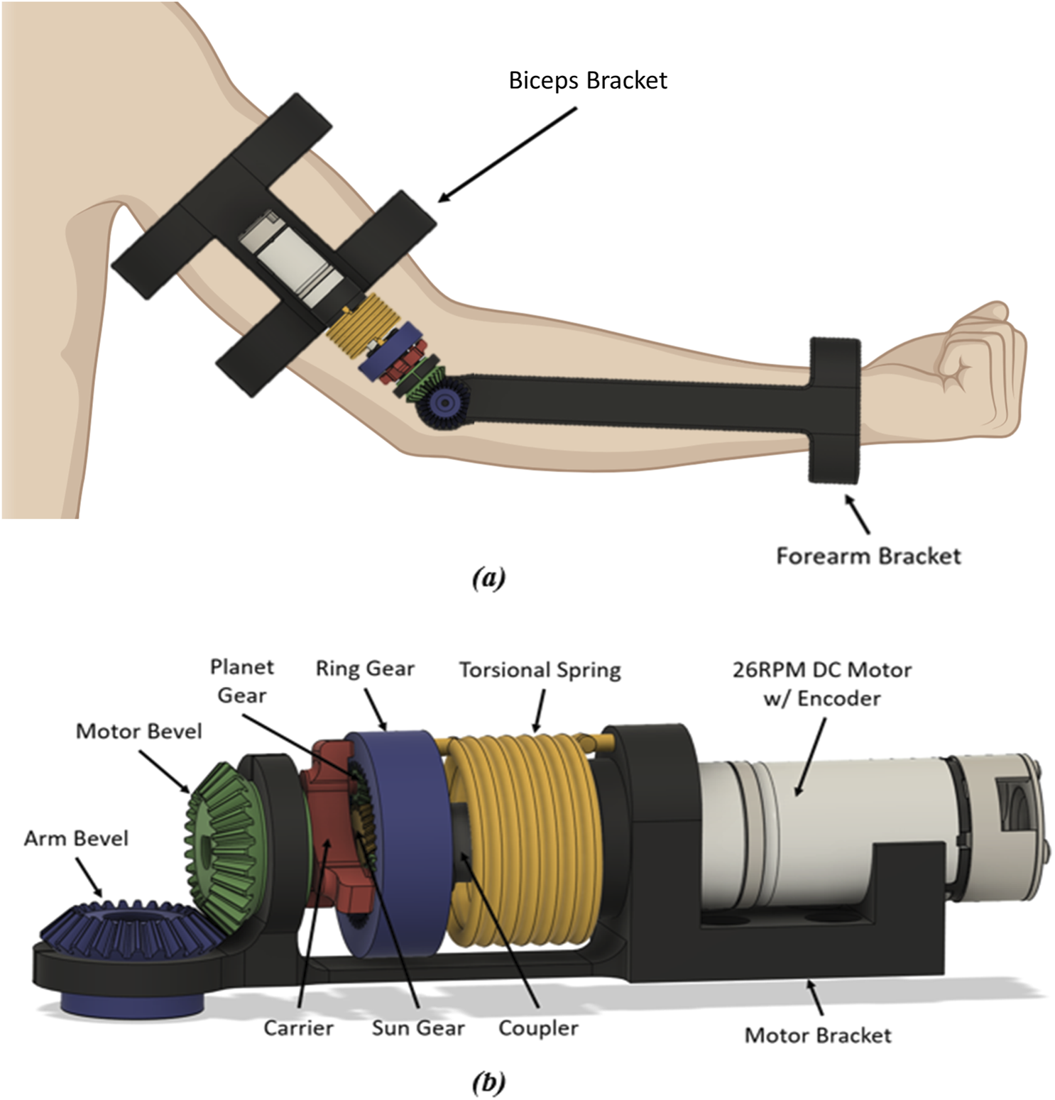 The planetary gear system, described above, has three parts that rotate relative to the fixed point. The chosen configuration utilizes the sun gear as the input and the carrier as the output to achieve a high gear ratio. The elasticity of the system utilizes a torsional spring between the ring gear and ground (fixed motor bracket). This includes the motor stator being fixed to the motor bracket and the rotor being connected to the sun gear. The DC motor has a speed of 26 RPM and 4.12 Nm of max torque to account for the 2.991 Nm loss torque by the user. The integration of the motor into the system and the component breakdown of the system are shown in Figure 3B.