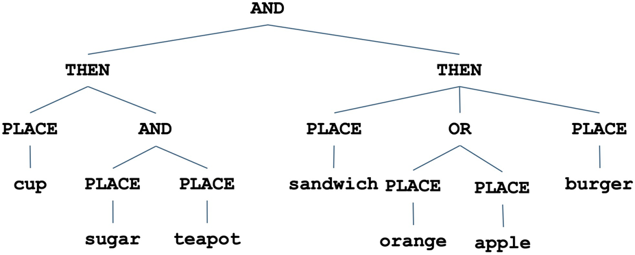 The human-robots task consists of placing some of the food/household objects in the order shown by the hierarchical tree representation: first, the burger and the cup have to be placed in their desired destinations, without any constraint on which is placed first, and then the teapot and sugar are placed at their destinations, also without any constraints.