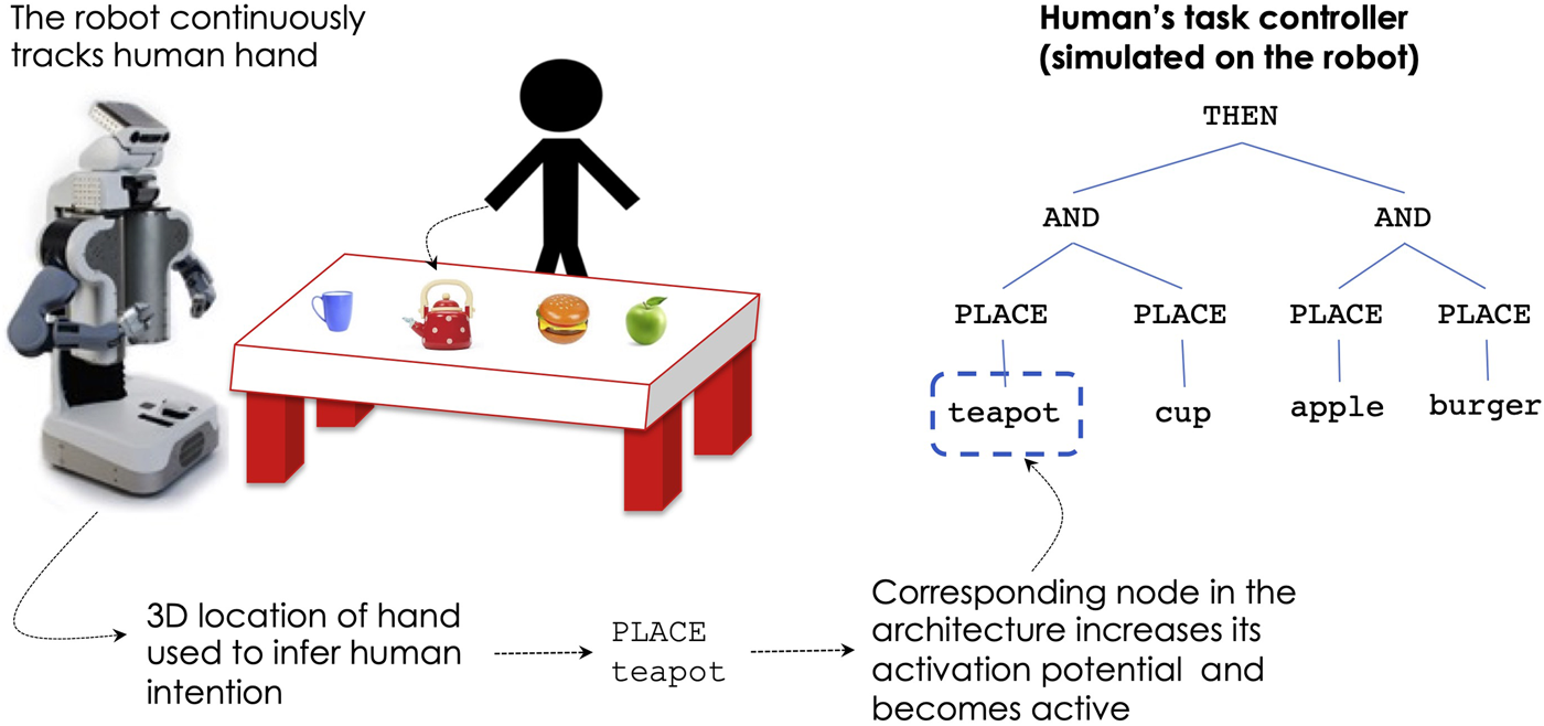 Figures 4–6 show the steps of node activation for human-robot coordination, for a generic task of placing some food and kitchen items. Throughout the entire execution the robot continuously updates the human’s simulated controller in order to keep track with the human’s task execution.