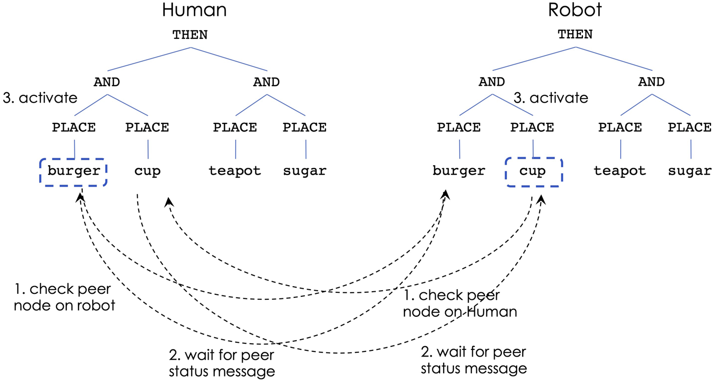 Figure 4 illustrates the decision process for situations in which the human and robot choose to work on different sub-tasks. Due to the THEN constraint at the top of the task, the left sub-tree is the first that needs to be performed. The human decides to place the burger, which, through the robot’s continuous observations, leads to activating the PLACE-burger node from the human’s controller. At the same time, if the robot’s activation level is highest for PLACE-cup (due to closeness to that object), the robot aims to activate that behavior. At this time both PLACE-burger (from the human controller) and PLACE-cup (from the robot) send messages to check the peer nodes on the other’s controller (step 1). Next, the nodes receive peer status messages indicating that the other teammate does not work on the same sub-task (step 2). This leads to activating the corresponding behaviors on both controllers (step 3).