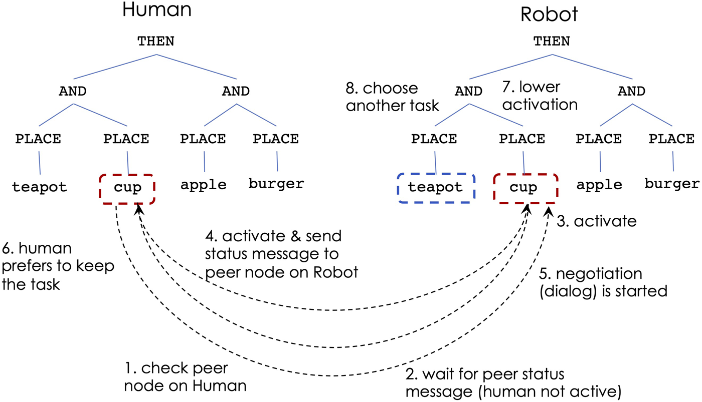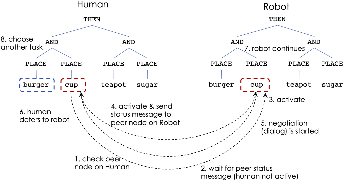 Considering the same task as before, the behavior activation proceeds as follows: if the robot’s highest activation level is for PLACE-cup, the robot’s corresponding node will send a check status message to its peer from the simulated human controller. If the peer node responds as not active (step 2), the robot activates its PLACE-cup behavior (step 3). However, if the PLACE-cup node on human controller becomes active immediately after, a status message is sent from the human controller to the peer node on the robot (step 4). Since this represents a conflict of overlapping goals, the robot stops its execution and initiates a dialog (step 5). If the human indicates a preference to continue with the task (step 6) via a verbal response, the robot lowers its activation for the PLACE-cup behavior and chooses another task, which in this case is for PLACE-burger (step 8). If the human decides to concede the sub-task to the robot (step 6 in Figure 6), the robot continues with performing it (step 7) and the human chooses a different sub-task (step 8).