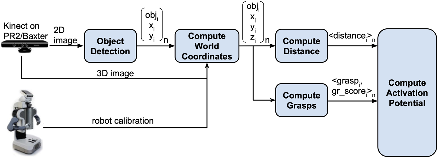 The perception-manipulation pipeline consists of multiple modules. The first module performs object detection using our previously developed vision system described in (Hoseini et al., 2019). This system uses input from a Kinect mounted on the robot’s head to detect the objects.