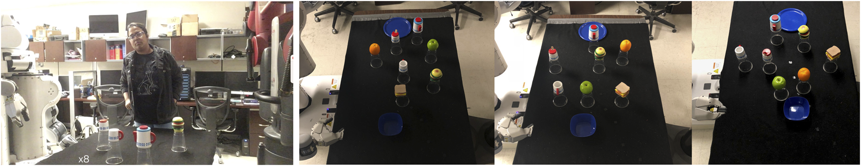 The initial setups for the human-robot and multi-robot experiments are shown in Figure 10. For this setup, the Baxter and PR2 robots were placed on either side of a table with the objects in between them. In the human-robot experiments, the human sits at one of the free sides of the table. The goal locations for the objects are as follows: the burger and the teapot are placed on the human side of the table, while the cup and the sugar are placed on the opposite side.