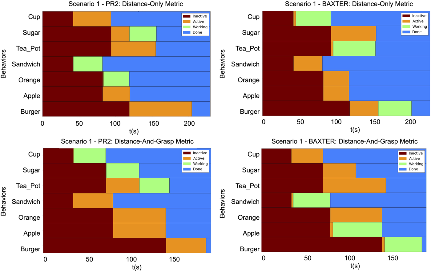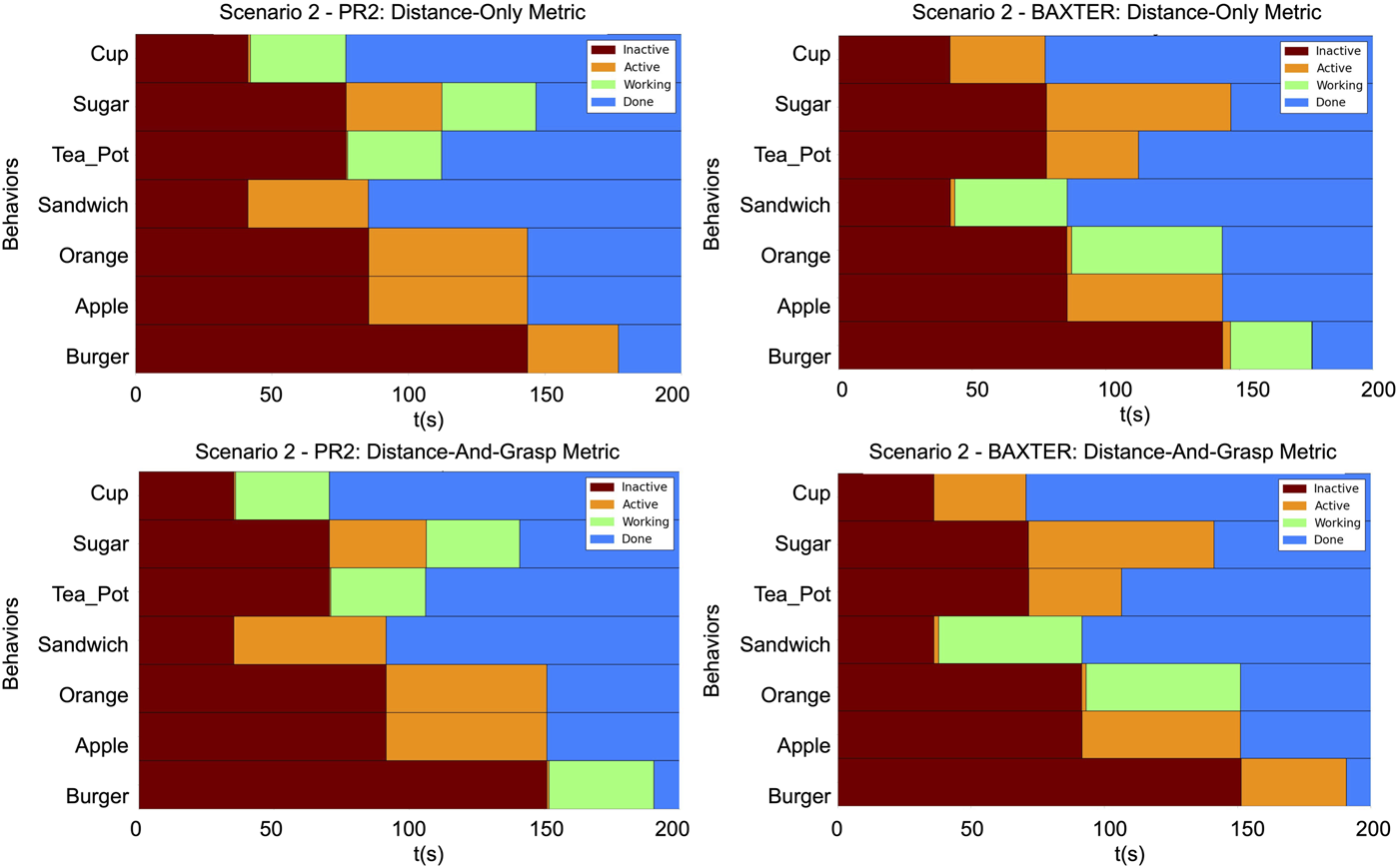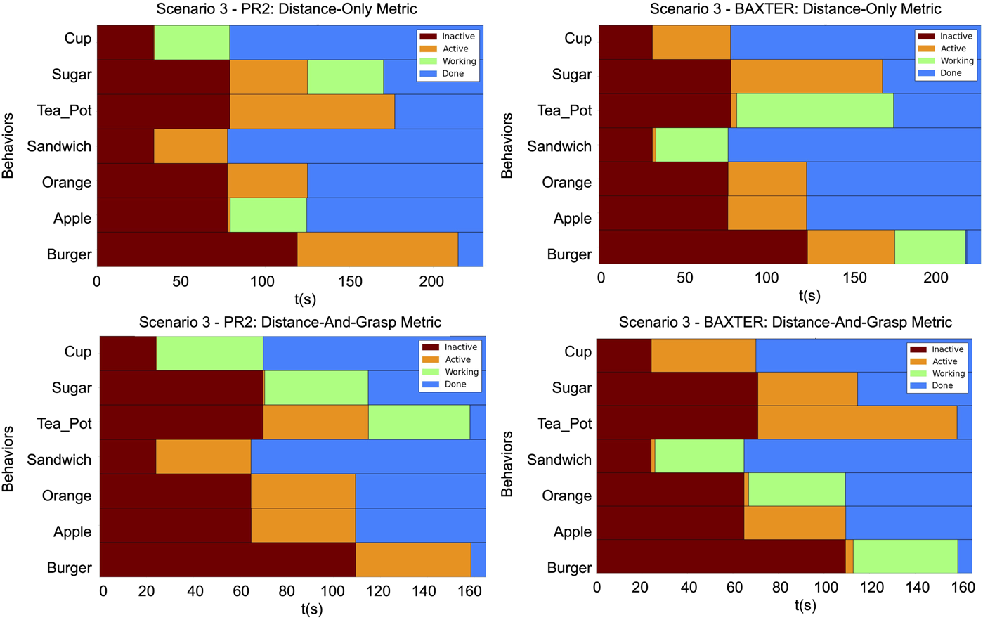 The timing diagrams for the different scenarios are shown in Figures 12–14. In each figure, the results of the two trials within a single scenario are shown. The top row illustrates the results of the first trial using the distance-only metric on the PR2 and Baxter. The bottom row illustrates the results of the second trial using the distance-and-grasp metric. Each of the individual timing diagrams illustrate the change of state of each node in the task tree for a given robot. The different color bars in the figure represent the times during which a particular pick and place behavior node is in one of the following states: inactive, active, running, or done. The intervals corresponding to the running state identify when a given node is being executed and are thus indicative of the order in which various sub-tasks have been performed. Additionally, the grasp scores for the different scenarios for each robot are given in Tables 1, 2. These scores differ across trials and robots due to the different environmental conditions in each scenario as well as different grasp capabilities of each robot. The results of each scenario are discussed below.