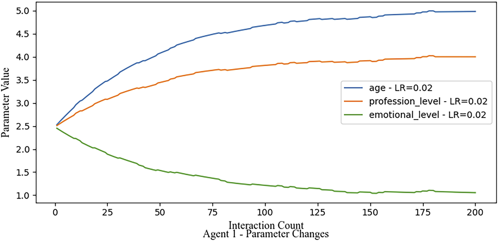 In each experiment, we defined three parameters for each agent: age, profession level, and emotional level. These parameters serve as the foundation for decision-making within the marketplace module, which uses a predefined rule set to select the optimal agent for a given task. In the following experiments the Agent 1 has an example goal parameter set of [5, 4, 1]. The initial parameters are set at [2.5, 2.5, 2.5], serving as a baseline before any feedback or adjustment is applied. Since the experiments were conducted in a simulated environment without actual robotic platforms, the selection of each agent is determined based on the rule set in the marketplace which uses the Manhattan Distance and simulated feedback.