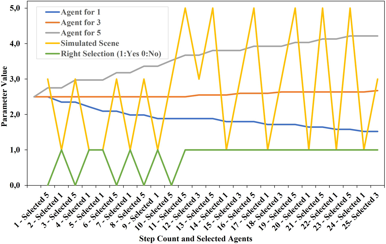According to the distribution of the randomly shown scene parameters, adjustments of the individual agents in the direction of their exemplary assumed values become visible. Together with this adaptation process, an increasingly targeted selection of agents takes place, although all agents were initialised with the same parameters, as in the other examples.
