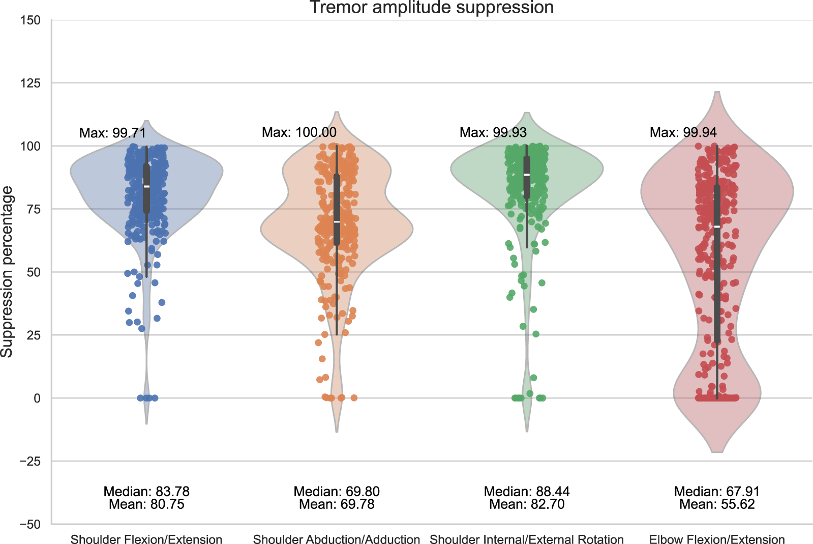 The result is an intelligent tremor-suppression controller that minimizes its effects on the patient’s original movements and posture, with no additional training required from the patient to adapt to the exoskeleton.