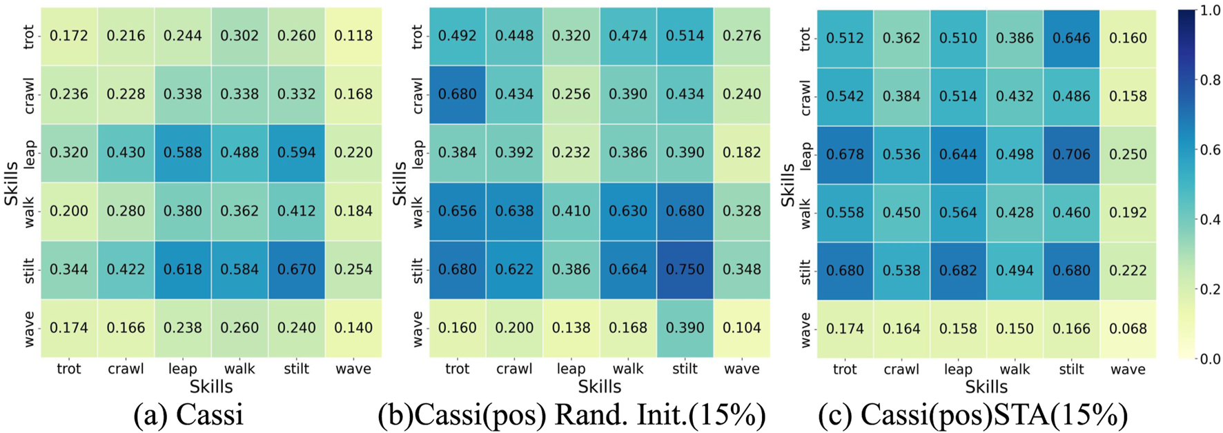 During the initialization phase of the Cassi algorithm, 85% of the samples are selected from the expert dataset, while 15% are randomly generated. Figure 5a displays the survival rates of agents in “trimesh” terrains using the Cassi method via a heatmap, where the expert dataset includes complete motion characteristics of the skills. Figure 5b (Cassi (pos)) and (c) (Cassi (STA)) both show scenarios after removing velocity information, with (c) specifically illustrating the application of the STA method in the with random initialization. Despite the removal of velocity information, the STA method still improves the survival rates of agents on untrained “trimesh” terrains, thereby enhancing the generalization of the strategy. Comparing the three methods, the survival rate for ‘wave’ is consistently low, mainly due to the skill’s intrinsic properties. The wave-like nature of its base motion trajectory increases the likelihood of contact with the ground in “trimesh” terrains, resulting in a lower survival rate. Despite some skill pairs showing slightly higher survival rates in Figure 5b, this may be due to the lack of a strict one-to-one correspondence between commands and skills, leading to additional training opportunities for some skills. Detailed analysis and data will be presented later in the text.