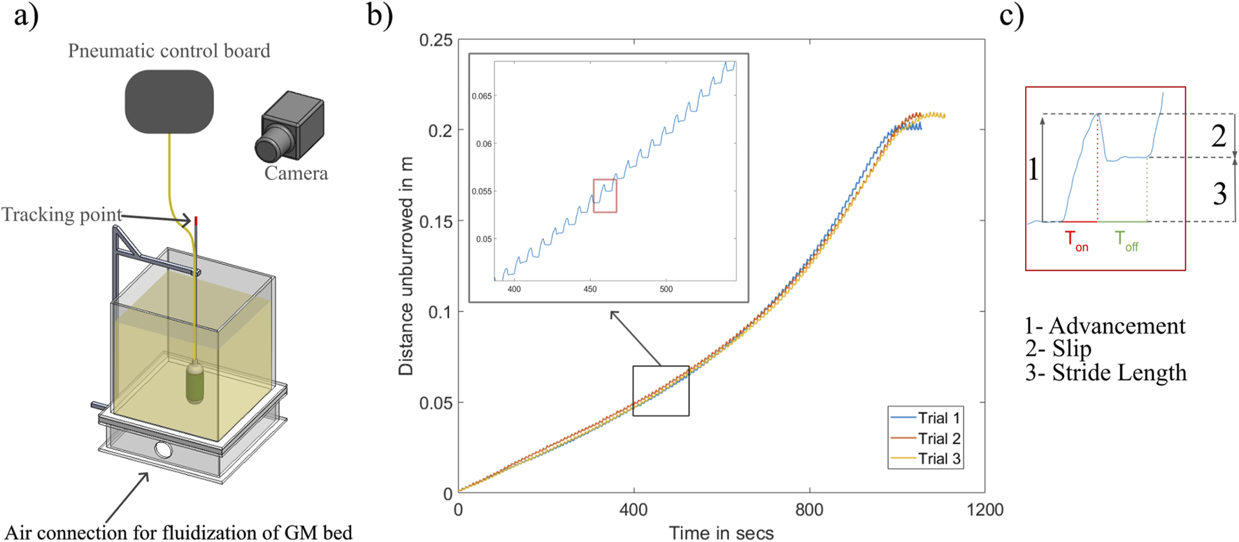 To characterize the behavior and performance of the unburrowing mechanism, we performed a set of three trials with the half-skin variation. The robot in this configuration weighed 200 g. We regulated the supply pressure (connected to the fluidic control board) to 10 PSI. Due to the interactions with the surrounding GM, we assumed that the extent of radial expansion of the bladder at a given internal pressure would be inversely proportional to the depth of the sand in the robot. To track the position of the robot, we attached a long, hollow aluminum tube with a diameter 6 mm to the top of the robot to protrude out of the sand throughout the experiment in order to track the position of the robot as it unburrowed (Figure 5a). After each test, we used a video analysis software (Tracker Version 6.1.6, Open Source Physics) to track the position of the robot over time.
