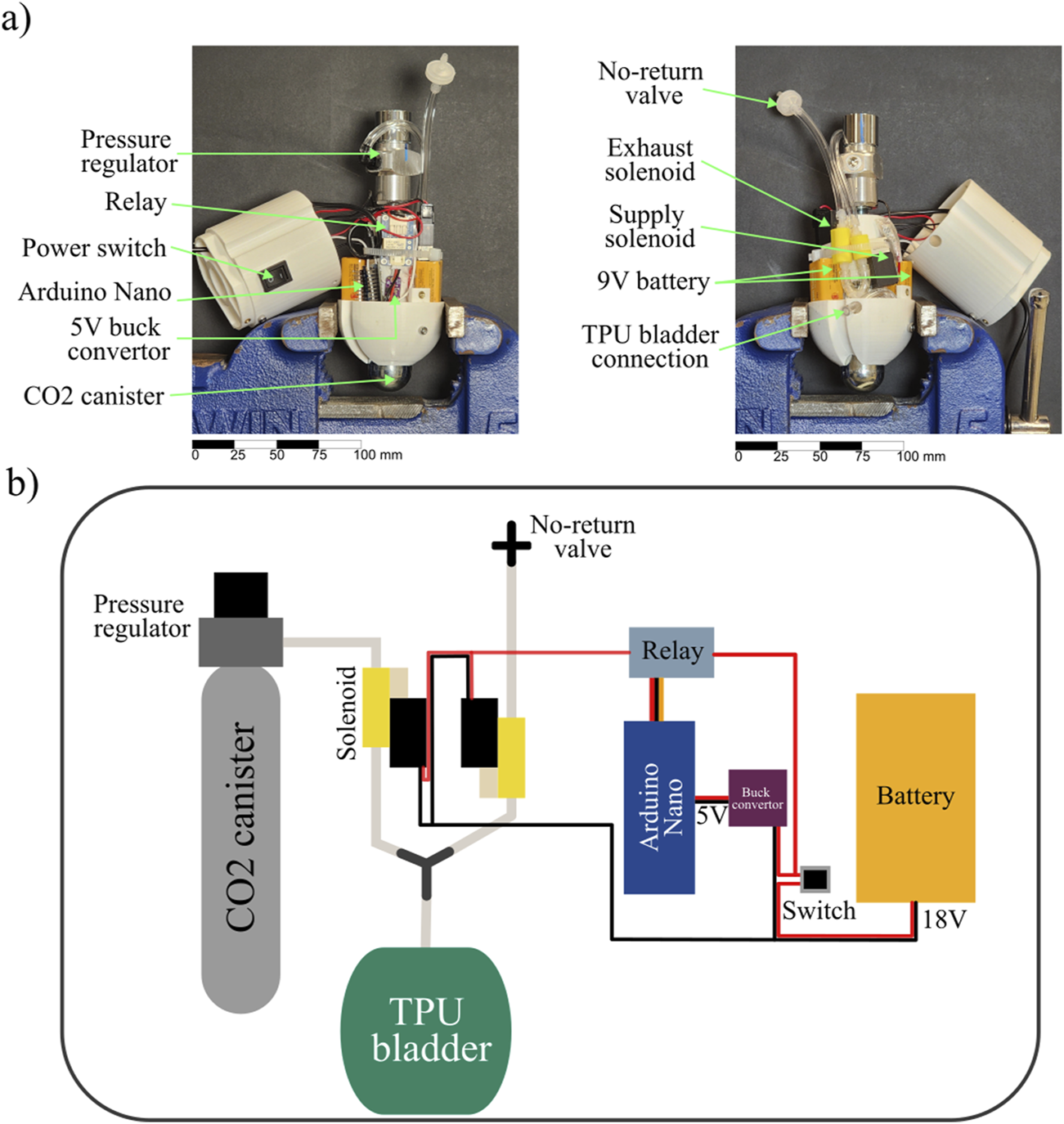 We designed a pneumatic system using a pressurized 45 g CO2 canister as our air supply (Figure 9a). We regulated the pressure from the