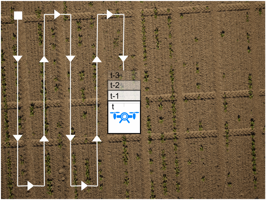 Example of a typical UAV mission. The coverage path along which we fuse semantic image labels is depicted in white, the square is the initial pose, and the arrows indicate the direction of movement. The images can overlap, but it is not required. This path maximizes the crop field coverage and is typically used in aerial data collection missions.