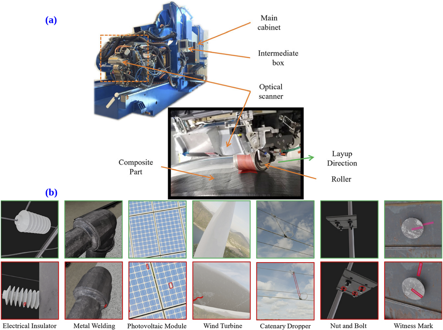 Figure 5. (a) Depicts depth images of composite carbon fiber surfaces, showcasing anomaly detection in the Automated Fiber Placement (AFP) industry (reprinted with permission from Ghamisi et al., 2024, licensed under CC BY 4.0). (b) Presents example images from the MIAD dataset, covering seven maintenance inspection scenarios. The test set for each scenario includes non-defective images (top row) and defective images (bottom row). The first four scenarios focus on surface anomalies, while the remaining three involve logical anomalies. Pixel-precise annotations are provided for all detected anomalies (reprinted with permission from Bao et al., 2023, Copyright © 2023 by The Institute of Electrical and Electronics Engineers, Inc.).