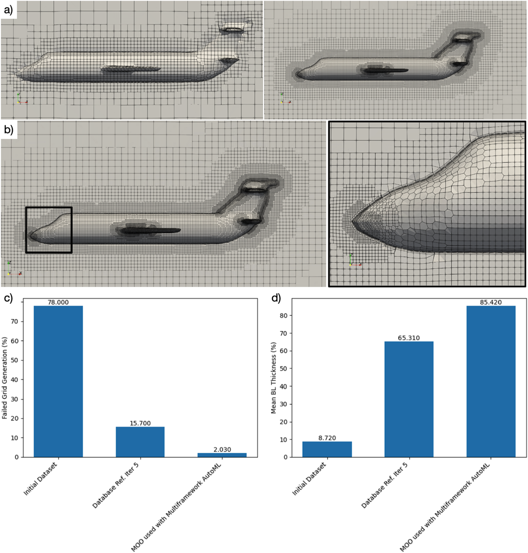 • Autonomous CFD setup. An AutoML-driven optimizer, seeded with Latin hypercube sampling (LHS) (McKay et al., 1979), raises BL-CP on previously unseen aircraft geometries while sharply reducing mesh-generation failures.
