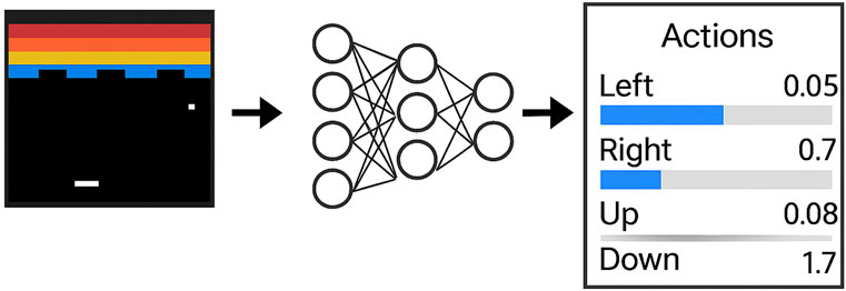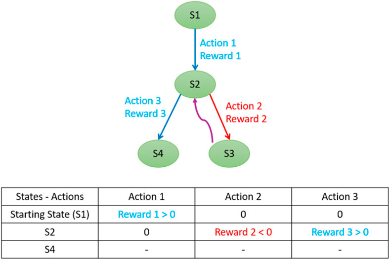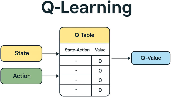 • Value-based actions: Here, the agent estimates the value of each action–state pair and selects actions based on these values (e.g., by choosing the action with the maximum value). For example, in Q-learning, the Q-function estimates the expected reward in a Q-table, and the agent selects the action with the highest Q-value (Lapan, 2018; Van Hasselt et al., 2016; Sutton and Barto, 2018).