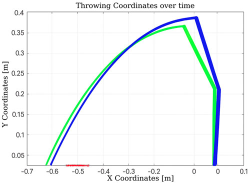 Controlling the trajectory of an object using a robotic system is a complex task; however, it is essential for performing tasks in dynamic environments. In such scenarios, the robot must continuously adapt and adjust the position and velocity of the end-effector to ensure the ball lands accurately in the basket. Two main challenges arise under these conditions. First, the robot must compute a valid solution or determine the correct trajectory configuration to successfully throw the ball into the target. Second, it must accurately adapt its throwing parameters in real time, including the release position and velocity, to overcome environmental constraints (Bombile and Billard, 2023).