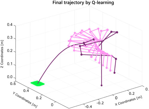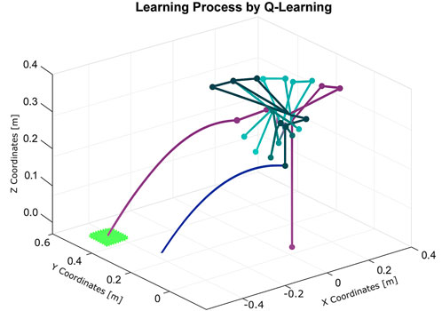 A comparison is conducted between two scenarios: (i) Q-learning with a limited number of discrete states and (ii) Q-learning with an expanded state space that includes a greater number of end-effector positions. This comparison is illustrated in Figures 15–17. By using a finer state discretization, the algorithm is less reliant on pure exploitation. This is important as excessive exploitation can cause the algorithm to overlook alternative promising trajectories. The broader state space increases the diversity of solutions available for the throwing task, often allowing the algorithm to converge more quickly. However, this also introduces a risk of over-exploration, where the agent continually explores new actions without sufficiently exploiting learned policies. To mitigate this issue, the Q-learning algorithm is further modified: if an action results in a negative reward, the agent returns to the previous state. This simple yet effective modification ensures consistent convergence by discouraging the repetition of poor actions and reinforcing successful behaviors.