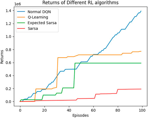 This approach allows the agent to first explore its environment through random actions and then use the gained experience to select the most appropriate actions for making an optimal policy (Sutton and Barto, 2018; Watkins, 1989; Mnih et al., 2013; Mnih et al., 2015; Van Hasselt et al., 2016). The Q-learning update rule is applied iteratively as the agent interacts with the environment, enabling it to learn the optimal policy for choosing actions across different states to maximize cumulative rewards over time. SARSA, an on-policy reinforcement learning algorithm, differs from Q-learning by replacing the term