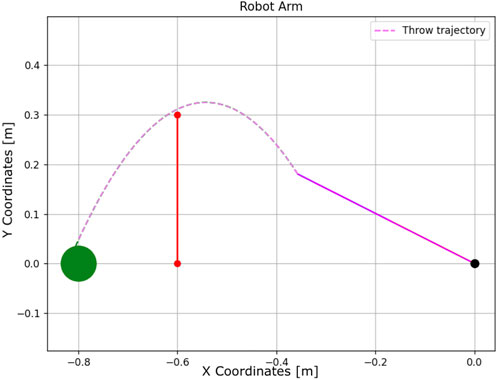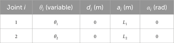 2. For the two-link planar arm (Figure 4, DH parameters provided in Table 4), used in the throwing task, the defined actions for both joints are as follows: