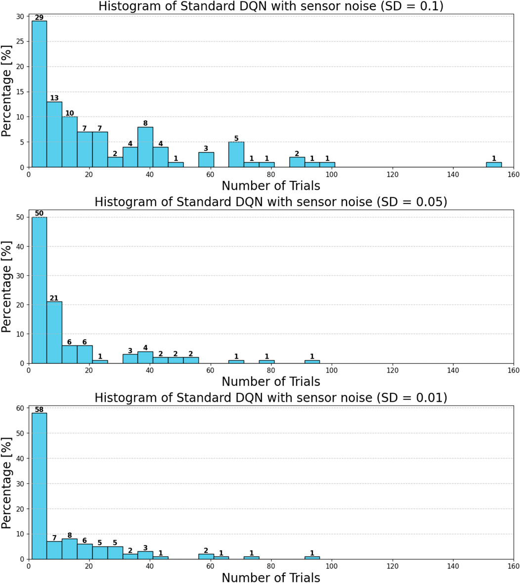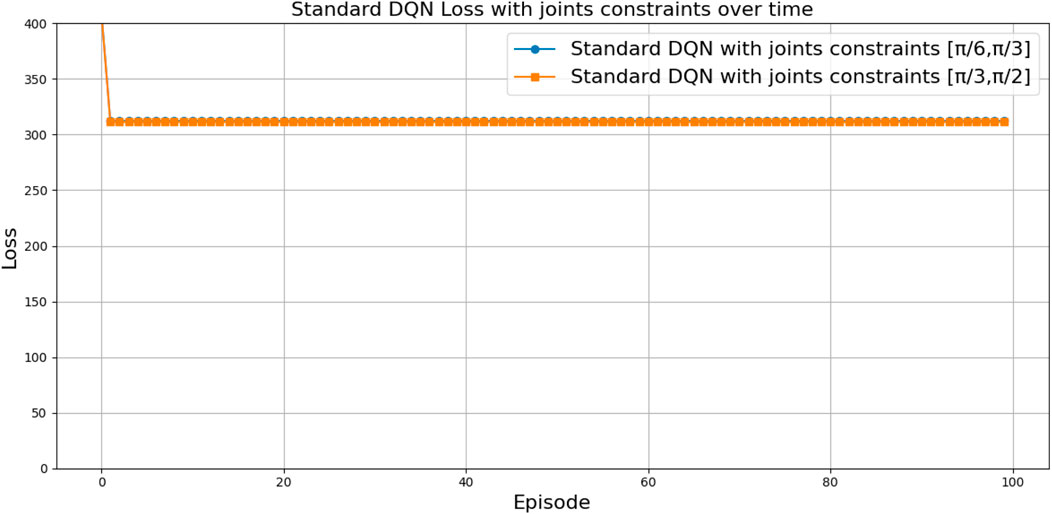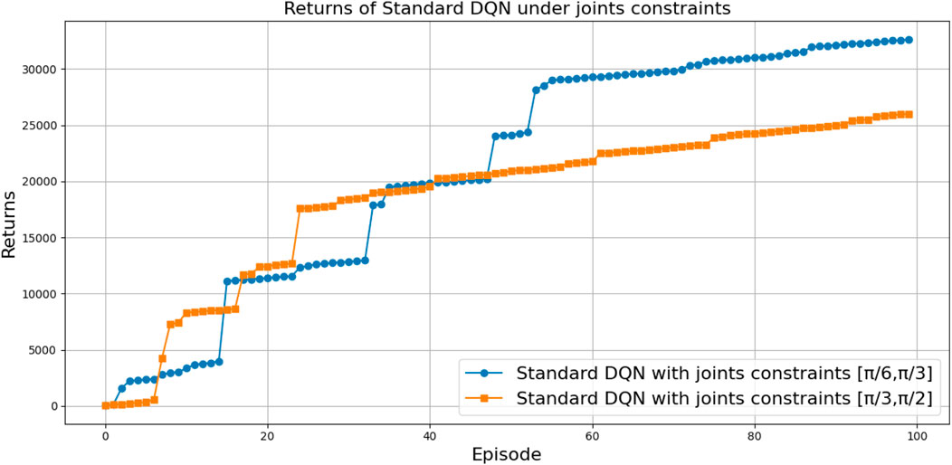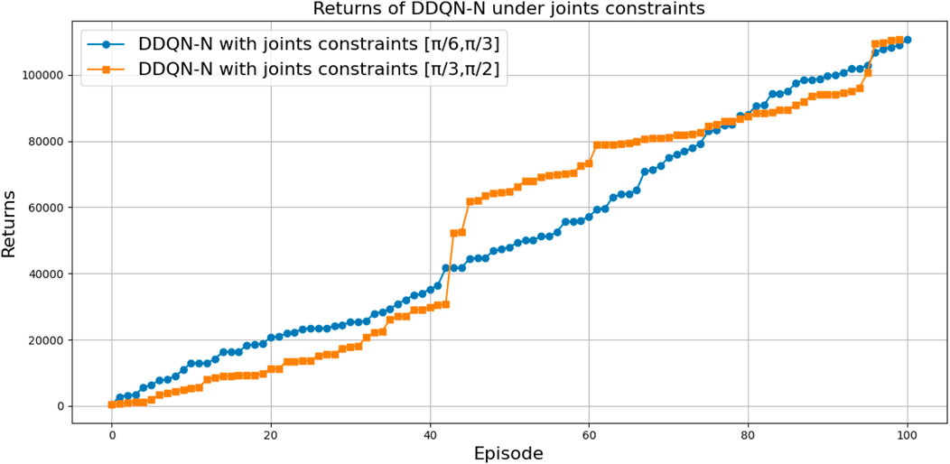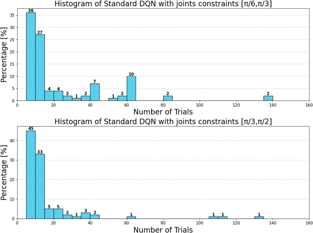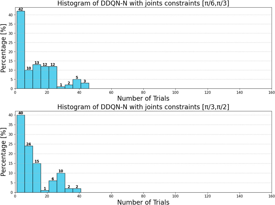 • The range of the joint constraint highly impacts the robot’s performance. For example, in the case of the first range, neither DQN nor DDQN-N could find the solution and the task has consistently failed. On the other hand, for the other two ranges, both DQN and DDQN-N were able to successfully learn the task.